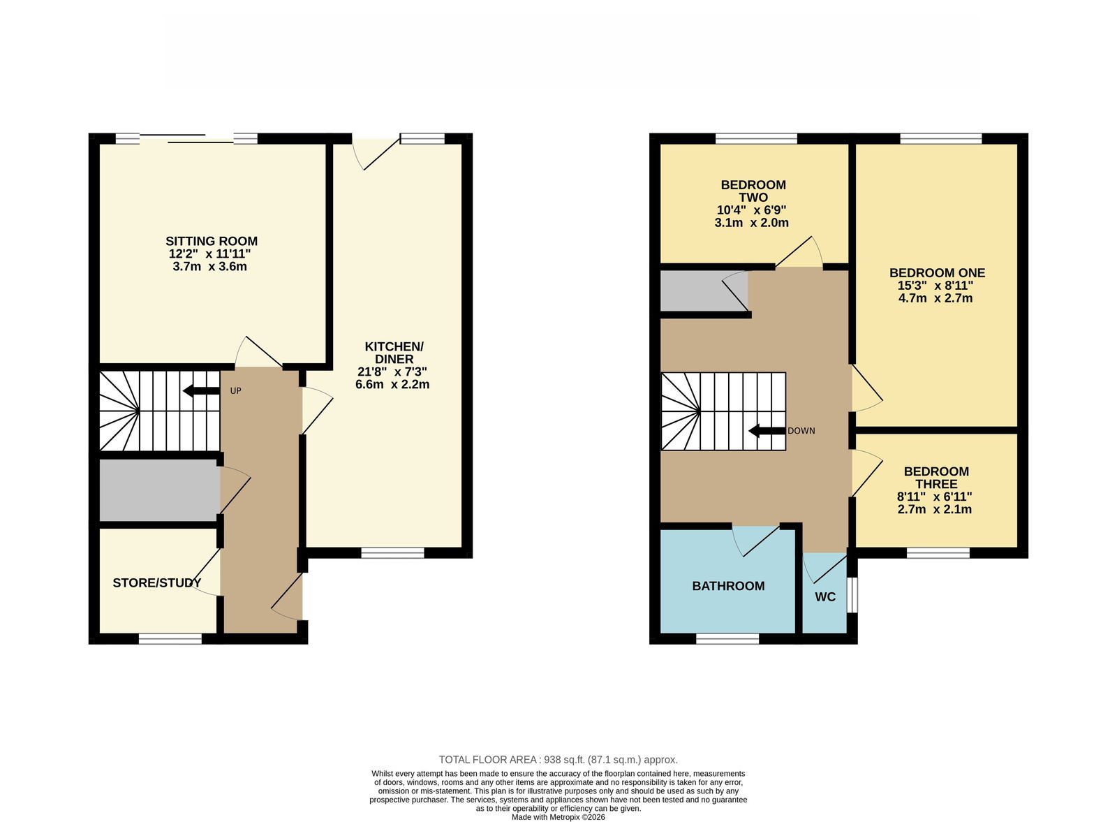 Internally, the property has been completely redecorated for sale and boasts a modern kitchen fitted approximately 18 months ago. There is UPVC double glazing and gas central heating throughout, with the living accommodation spanning over two floors and extending to a generous 938 square feet.