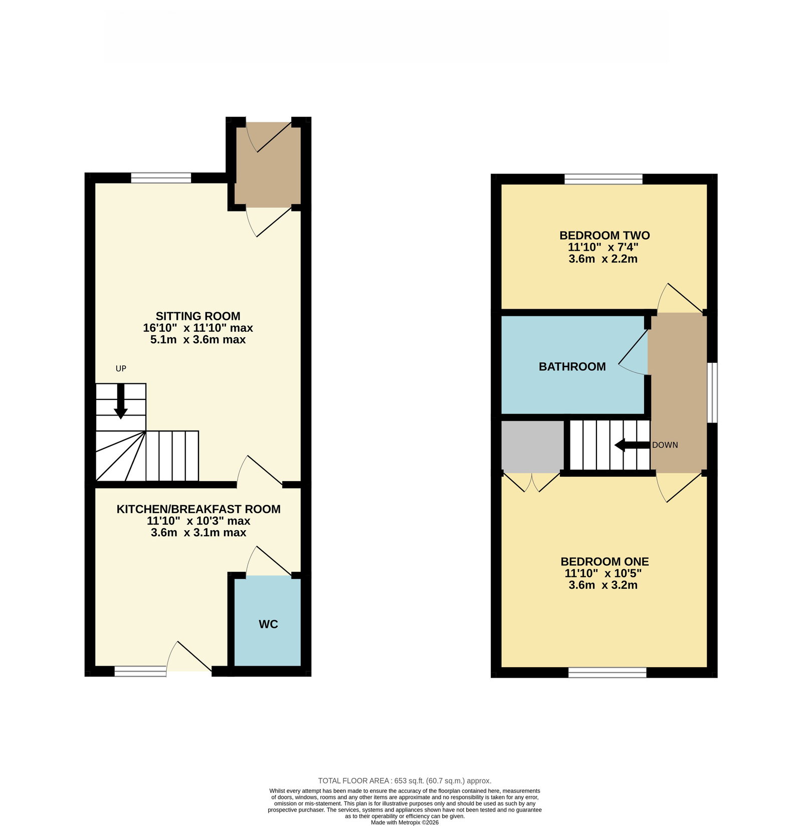 The living space is laid across two floors, extending to 653 square feet. There is an entrance hall that leads to the main sitting room, with a kitchen/breakfast room to the rear boasting direct garden access. There is also a downstairs WC. Upstairs are two double bedrooms and the family bathroom.