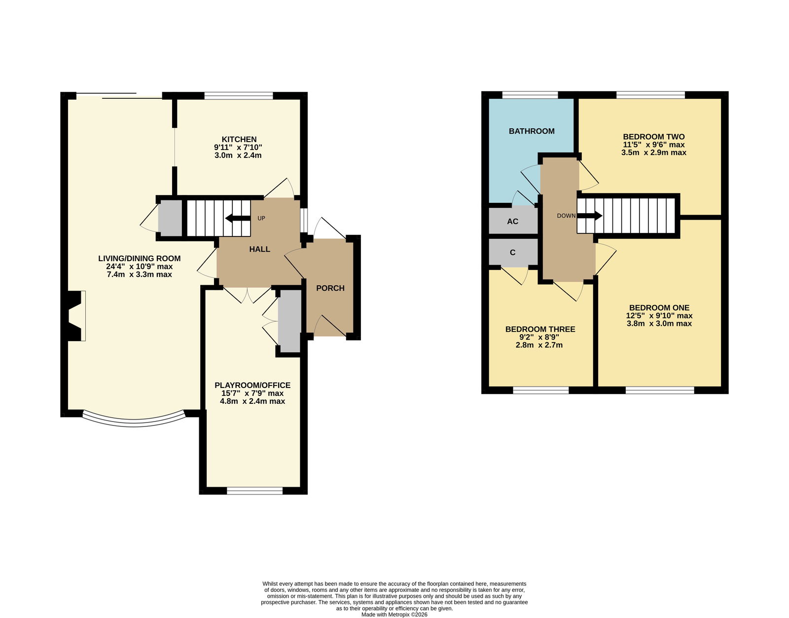 There is a light-filled, spacious living/dining room with a feature fireplace and a sliding door leading out to the rear garden. There is a second reception room, playroom, or home office. Fitted with contemporary storage providing space for white goods. Upstairs, you will find three good-sized bedrooms, two double rooms, and a family bathroom. The third bedroom has a useful storage cupboard.