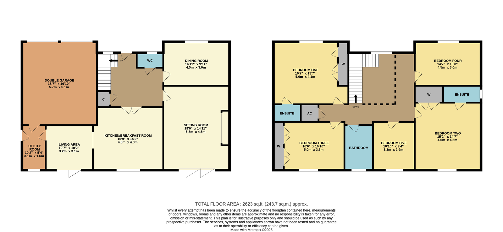 Five double bedrooms and three bathrooms (two en-suites)