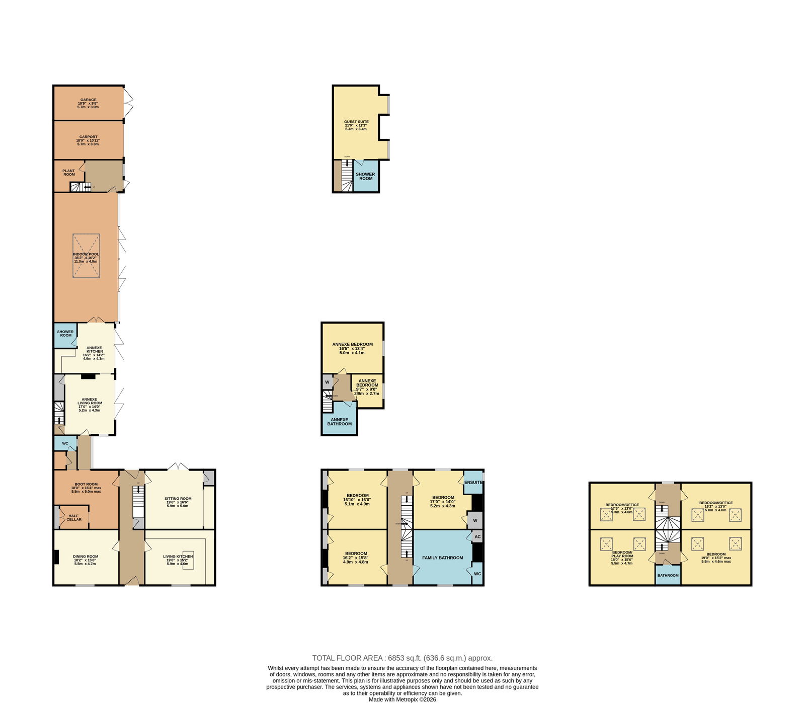 The total floor area measures approximately 6,800 square feet, including a seven-bedroom main house, a self-contained two-bedroom annexe, a separate guest suite, an indoor swimming pool, and a double garage. Complemented by lovely, landscaped private gardens and a gravel-laid driveway providing off-road parking for several vehicles.
