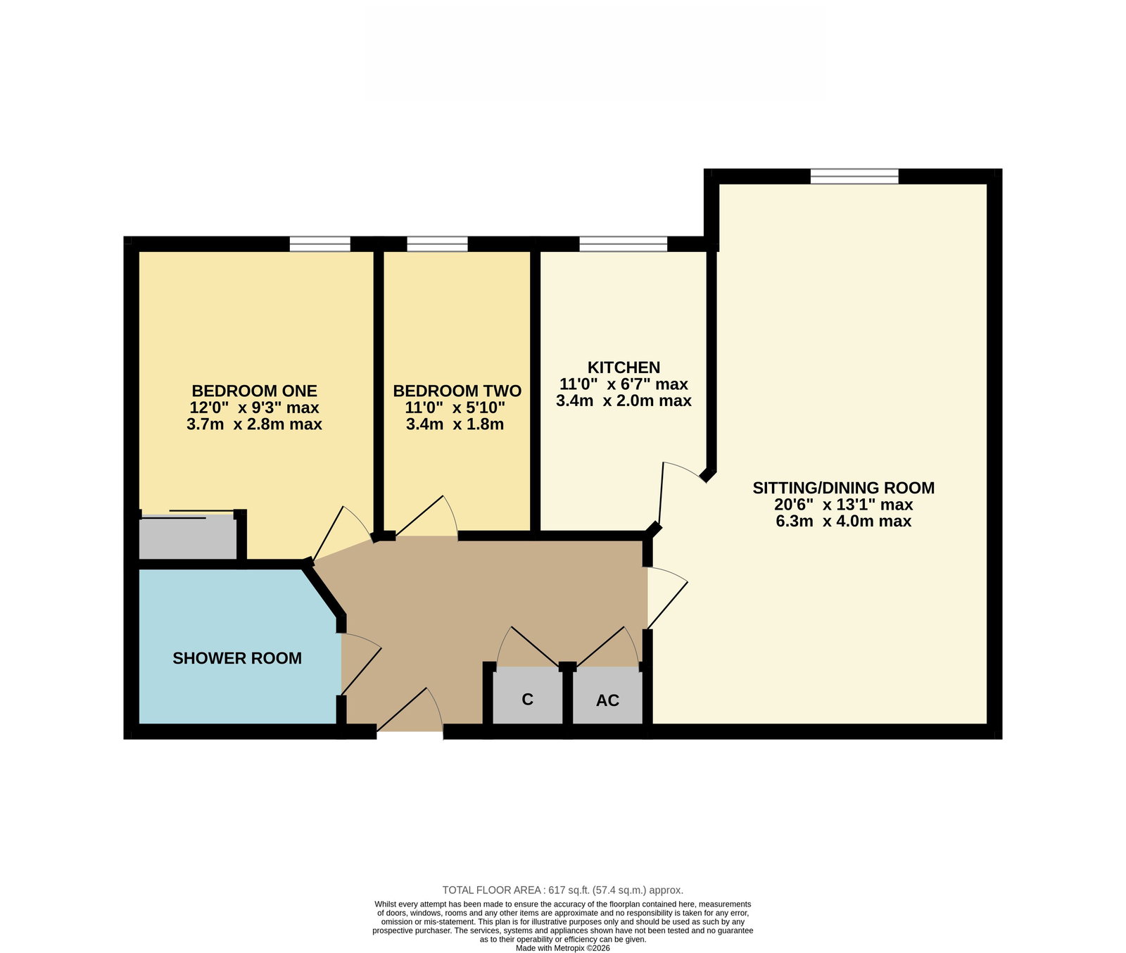 The floor area measures approximately 617 square feet. The living accommodation is centred around a generous entrance hall with a separate store and airing cupboard.