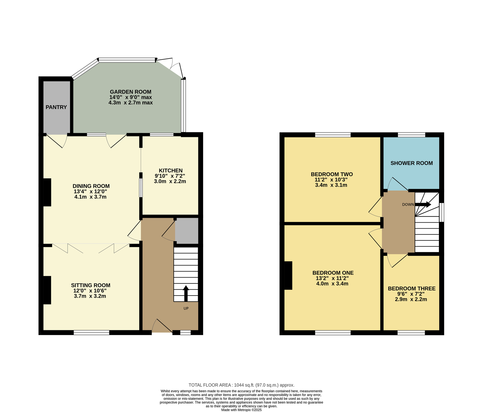 The property has a floor area of approximately 1,044 square feet, with gas central heating throughout. In brief, expect to find an entrance hall, a sitting room, a fully fitted kitchen opening into a dining room with a pantry cupboard, and to the rear is a lovely conservatory with views across the gardens. Upstairs, a central landing leads to three bedrooms (two generous doubles) and a modern shower room.